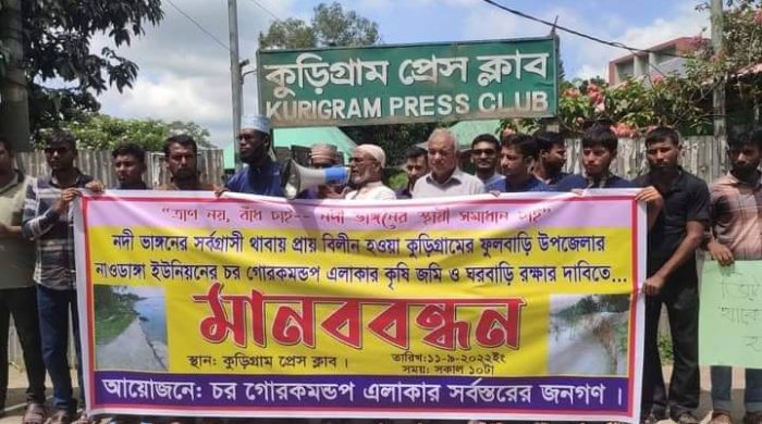 কুড়িগ্রামে ধরলার ভাঙ্গন রোধে মানববন্ধন কুড়িগ্রামের ফুলবাড়ী উপজেলায় ধরলা নদীর ভাঙ্গন রোধের দাবিতে মানববন্ধন করেছেন ক্ষতিগ্রস্ত এলাকার লোকজন। রোববার সকাল ১১:০০ টায় কুড়িগ্রাম প্রেসক্লাবের সামনে ঘণ্টাব্যাপী এ মানববন্ধন করেন উপজেলার