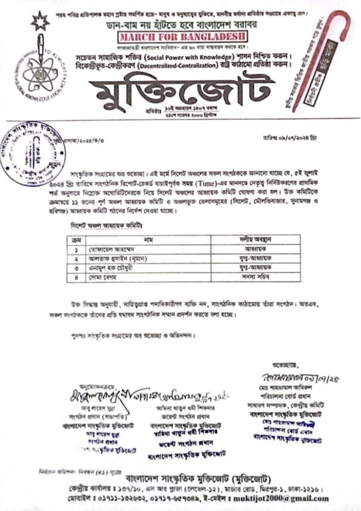 বাংলাদেশ সাংস্কৃতিক মুক্তিজোট-এর কেন্দ্রীয় কমিটির সংগঠন প্রধান আবু লায়েস মুন্না ও সাধারণ সম্পাদক, কেন্দ্রীয় কমিটি মোঃ শাহজামাল আমিরুল স্বাক্ষরিত এক প্রেস বিজ্ঞপ্তির মাধ্যমে সিলেট অঞ্চল কমিটির অনুমোদন দেওয়া হয়েছে। কমিটির আহবায়ক করা হয়েছে সাংবাদিক তোফায়েল আহমদকে, যুগ্ম আহবায়ক হিসাবে রাখা হয়েছে আলতাফ হুসাইন নুমান ও এনামুল হক চৌধুরী এবং সদস্য সচিব করা হয়েছে সোমা বেগম কে।